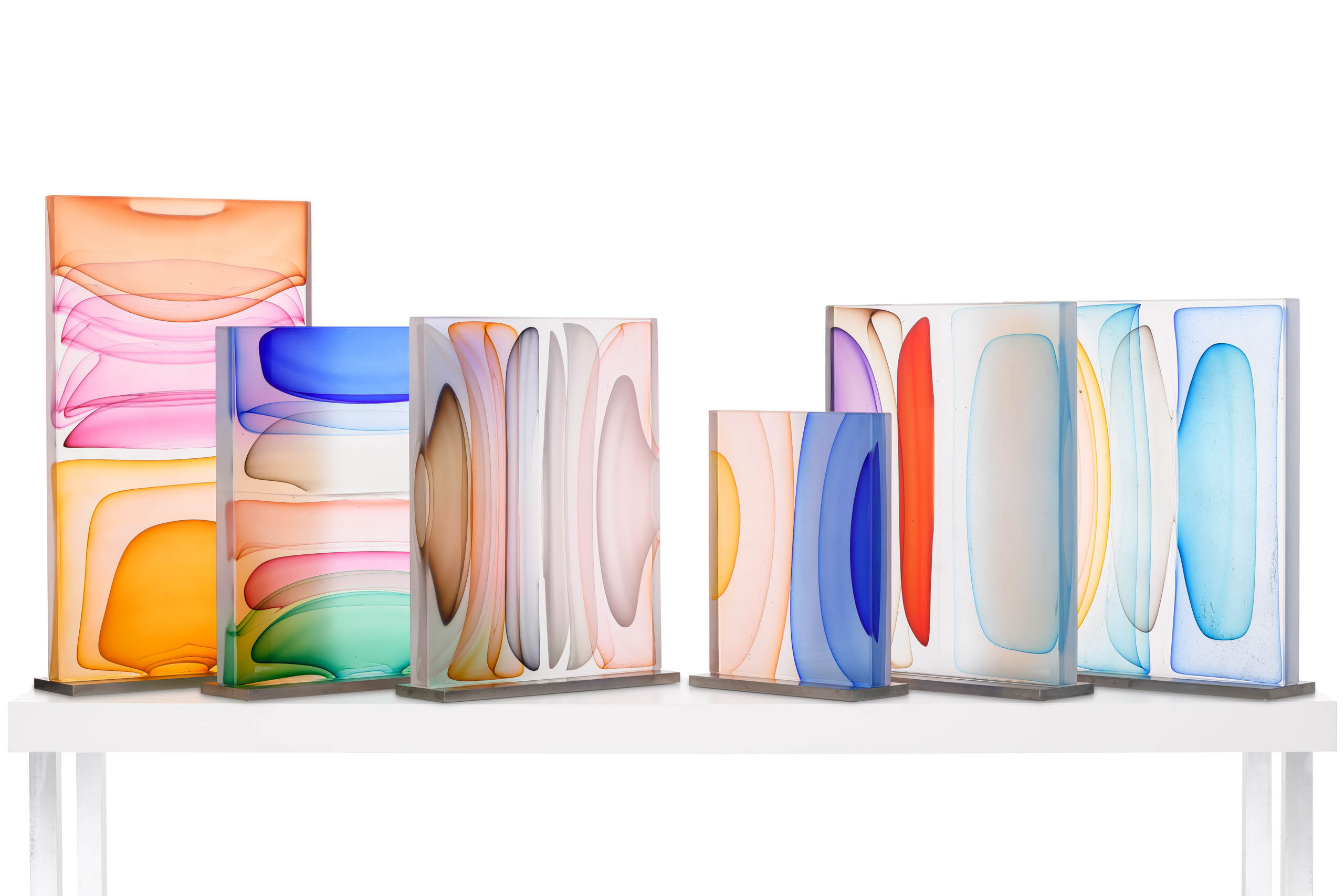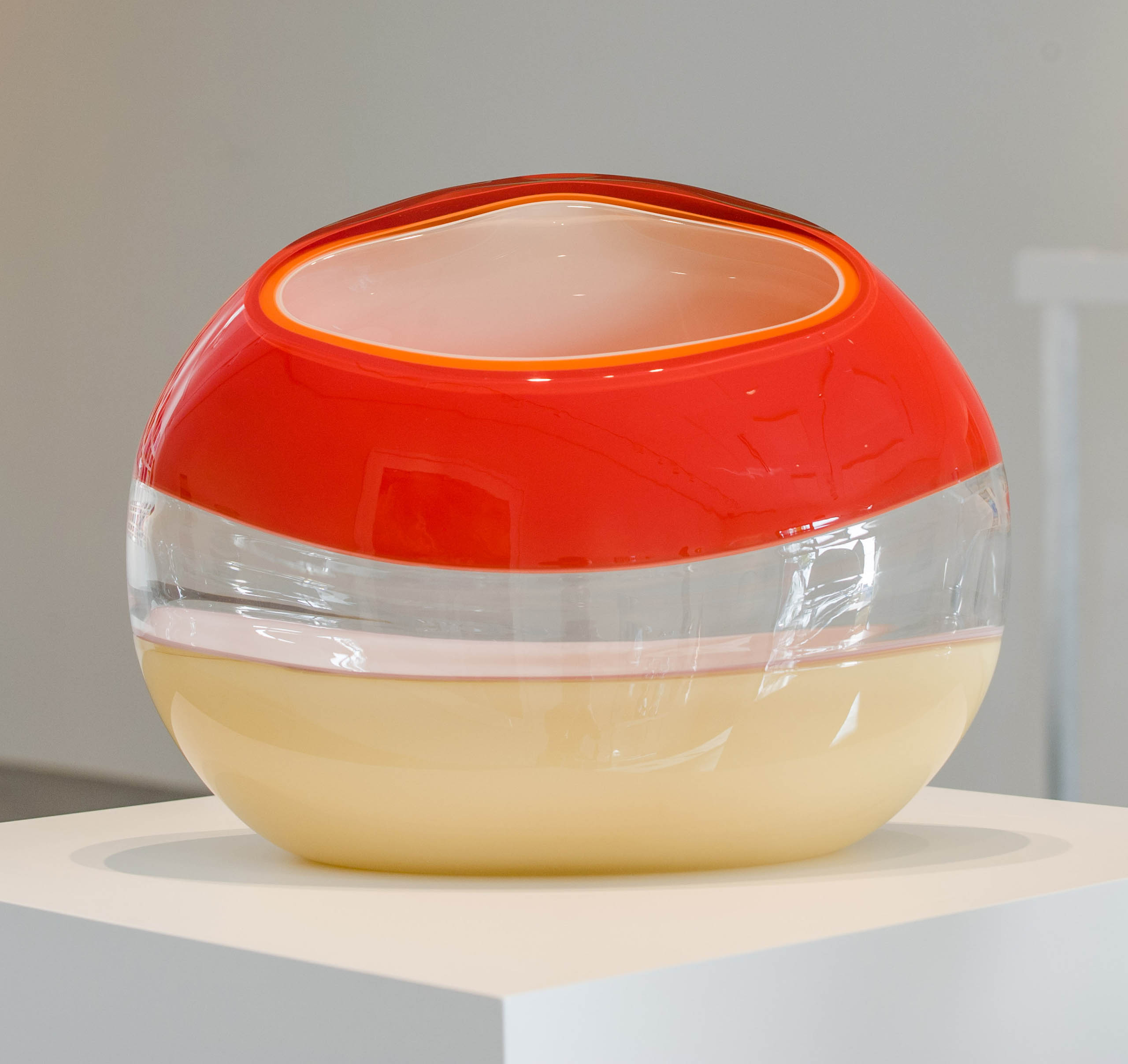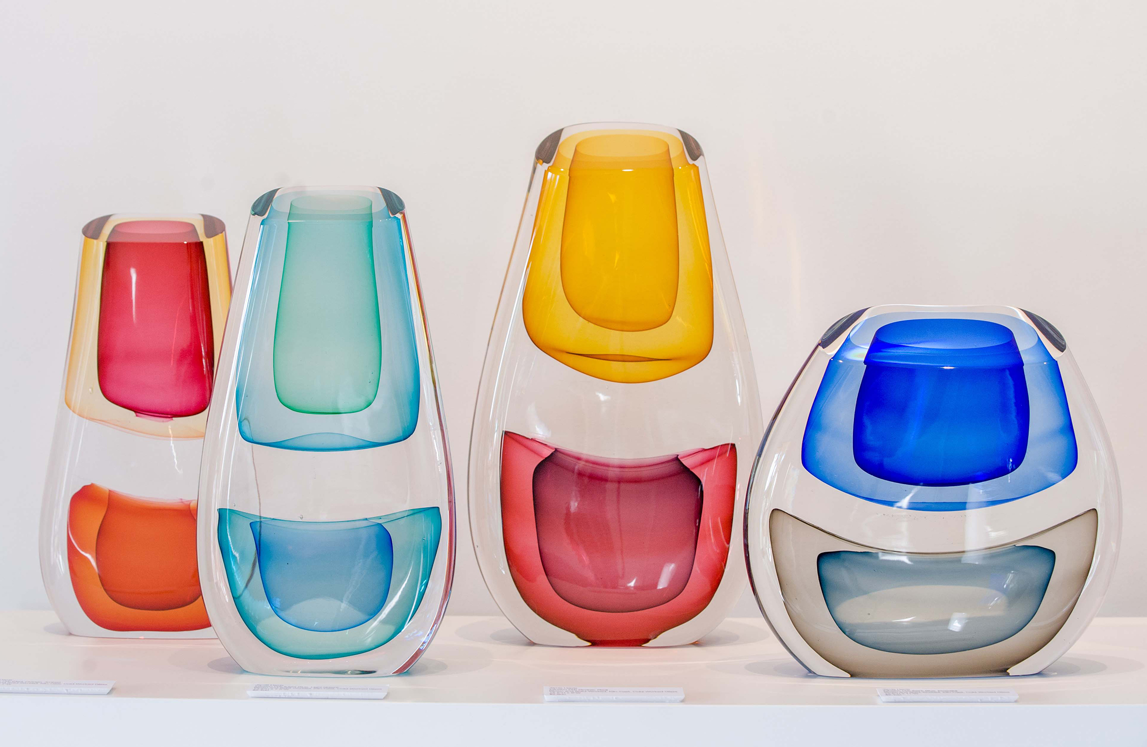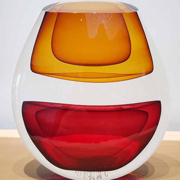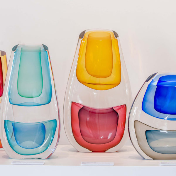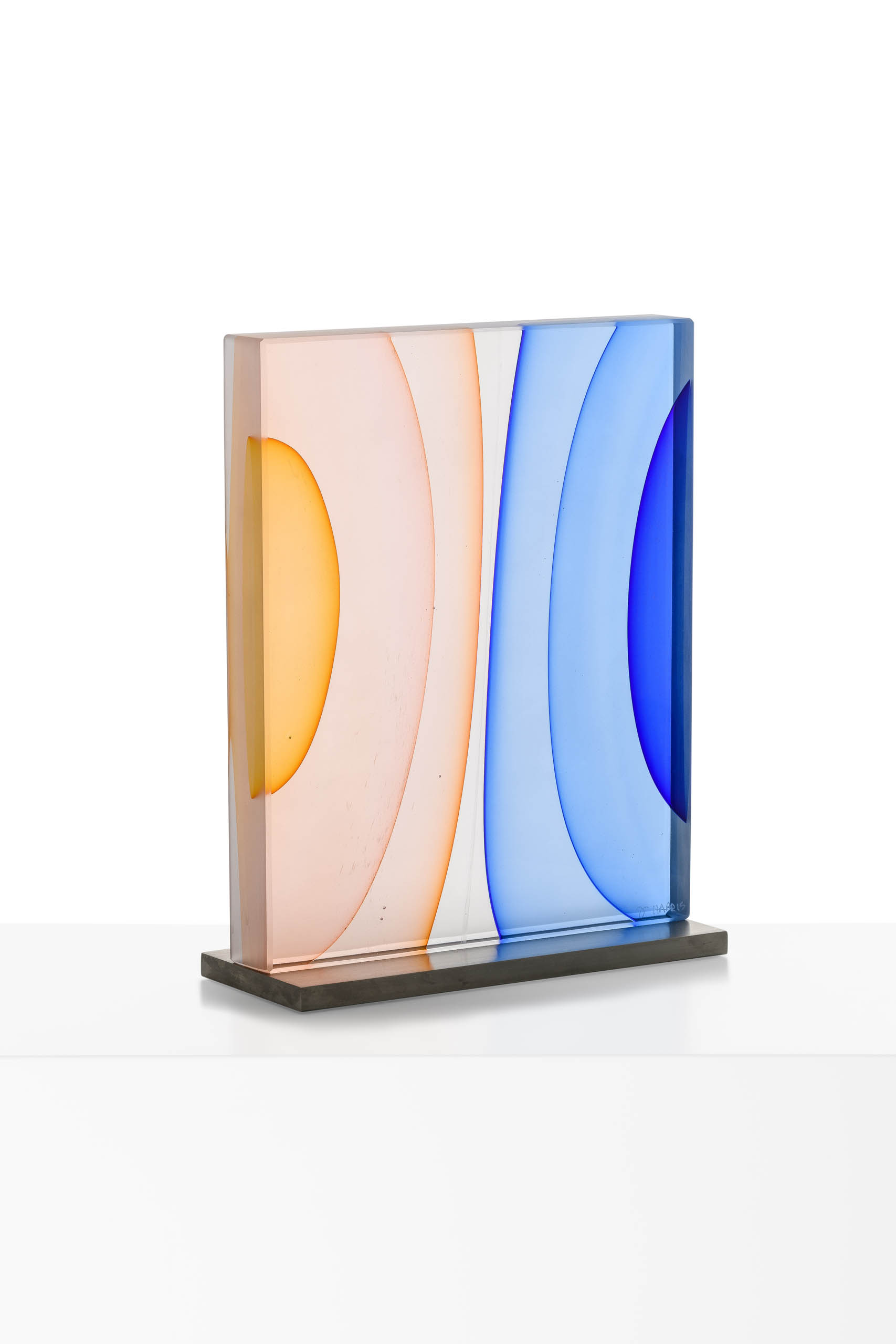 His sculptural glass work, which he describes as breaking from traditional approaches with a “painterly perspective,” uses loud splashes of color to capture the innate ability of glass to transmit, reflect and absorb light. This transcends both his blown pieces, and his cast wall panels, each which share his love for color and patterning. In his blown glass work, Harris merges a classic Venetian sensibility with a Modernist approach, fueled more by color theory and abstract concepts than reflections on historical glass. Harris also reinterprets traditional techniques, taking blown glass foundations as a method of building up form in a cast sculpture. Harris has also spent many years experimenting with the Italian technique of Incalmo as the basis for building a three-dimensional color field painting. His work is an ever-changing examination of color modulation, evoking emotional responses through visual contrast.