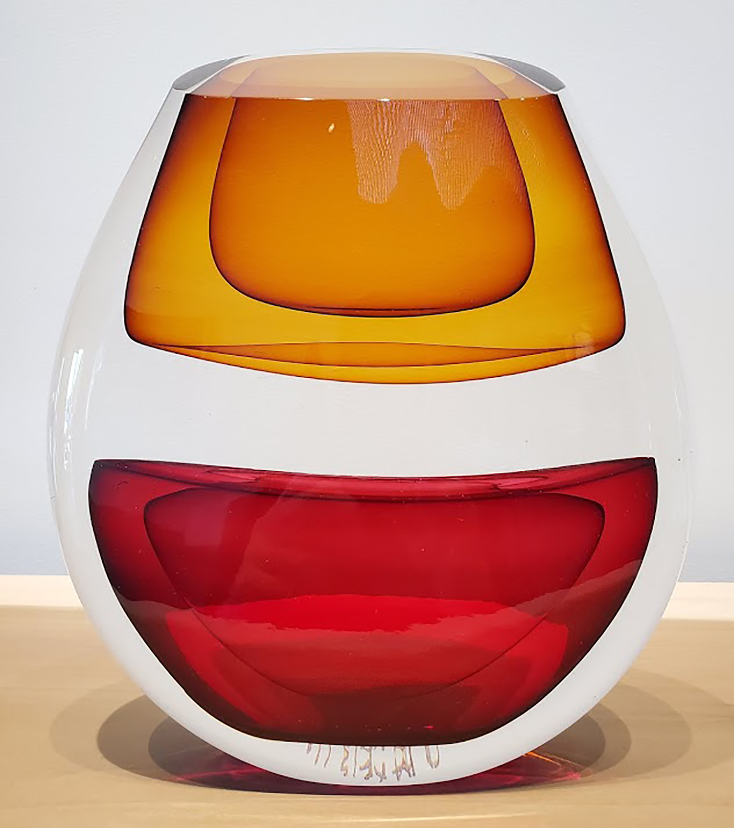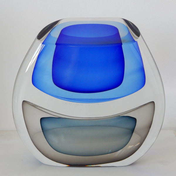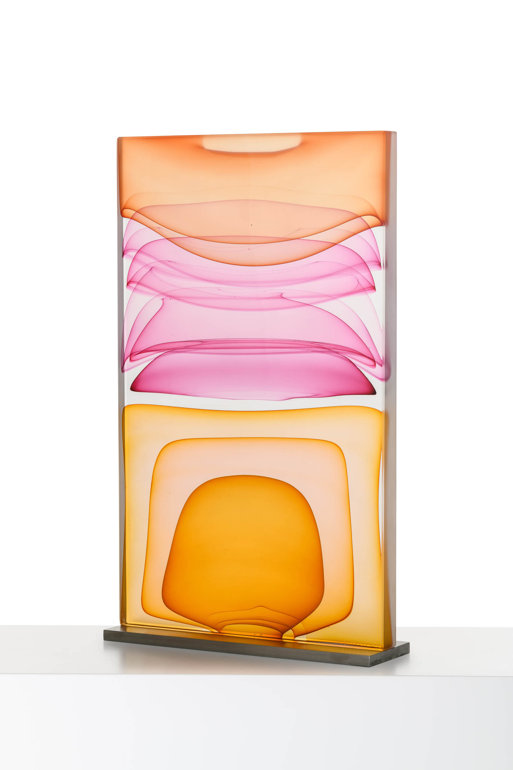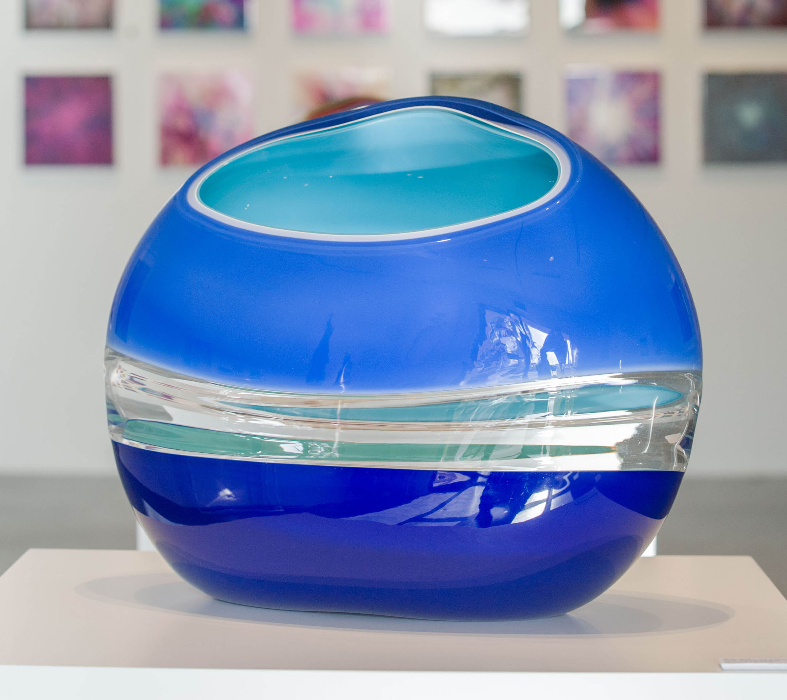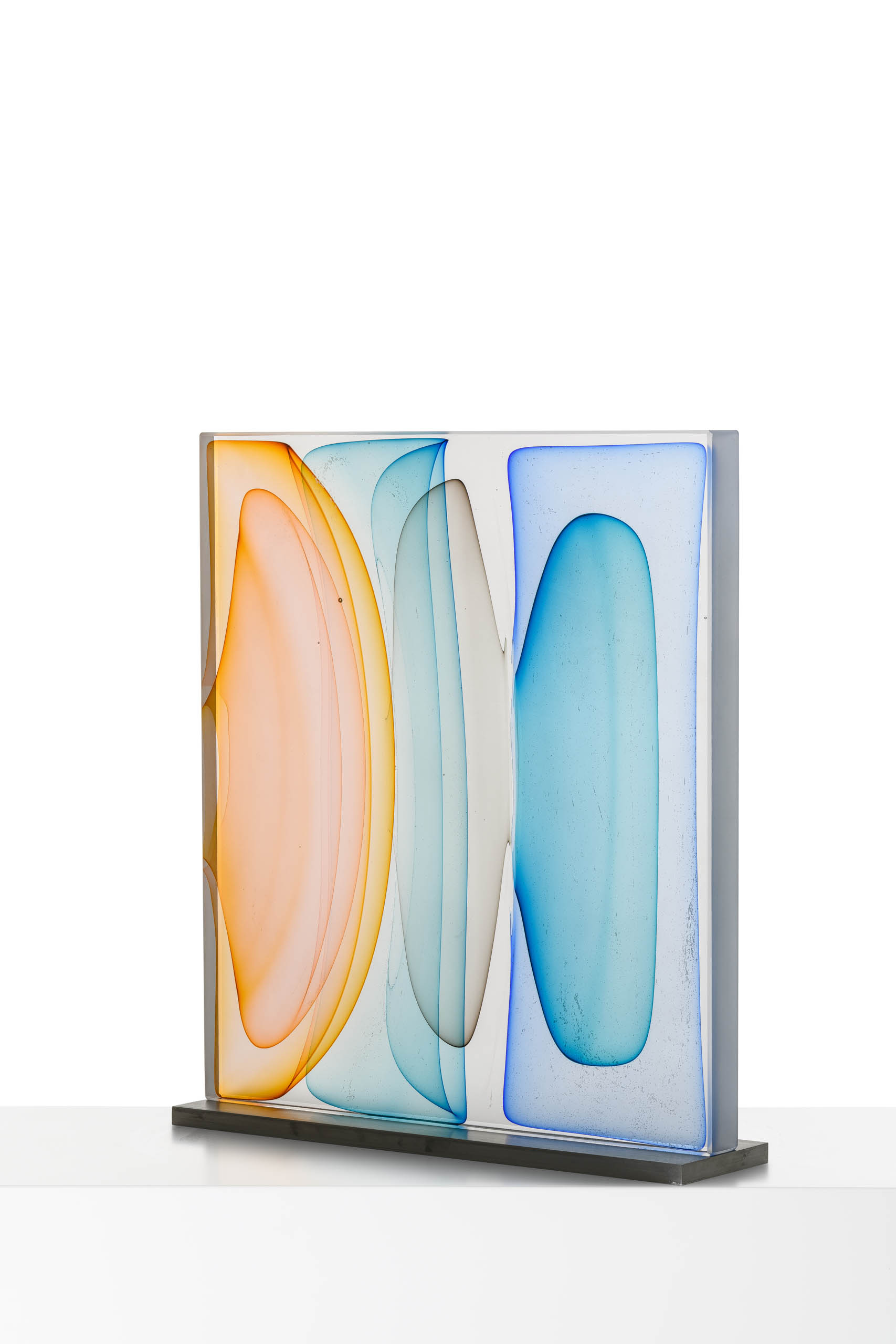 His sculptural glass work, which he describes as breaking from traditional approaches with a “painterly perspective,” uses loud splashes of color to capture the innate ability of glass to transmit, reflect and absorb light. This transcends both his blown pieces, and his cast wall panels, each which share his love for color and patterning. In his blown glass work, Harris merges a classic Venetian sensibility with a Modernist approach, fueled more by color theory and abstract concepts than reflections on historical glass. Harris also reinterprets traditional techniques, taking blown glass foundations as a method of building up form in a cast sculpture. Harris has also spent many years experimenting with the Italian technique of Incalmo as the basis for building a three-dimensional color field painting. His work is an ever-changing examination of color modulation, evoking emotional responses through visual contrast.
